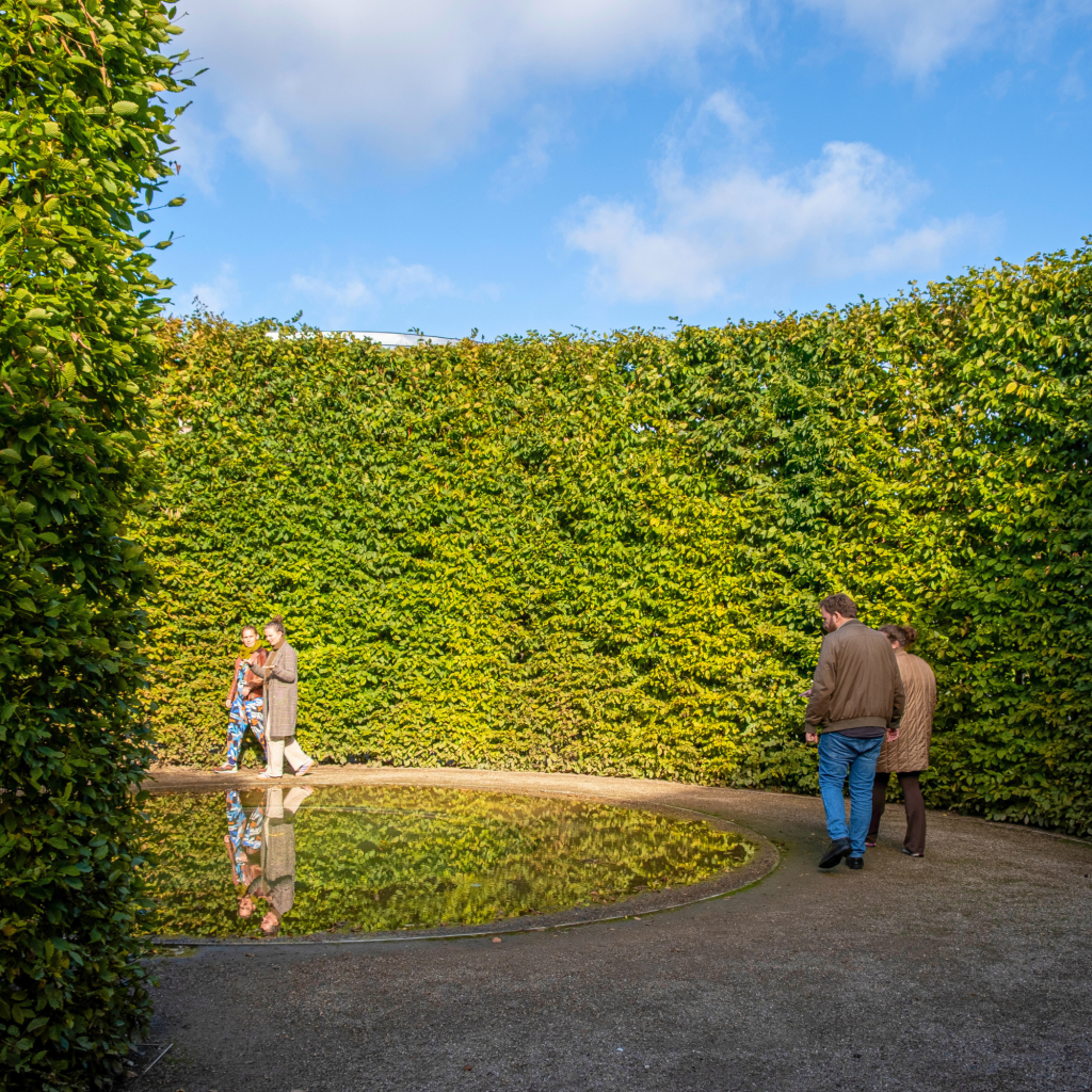 Spejlsøen trækker himlen ned mellem træerne som et blankt lærred mellem de bugtende hække. Kunne gæsterne se igennem vandet, ville der være direkte adgang til udstillingen nedenunder, hvor ”Den lille havfrue” svømmer rundt og kigger længselsfuldt op mod land. Ligesom hun kan gæsterne inde i museet se op gennem vandspejlet til de drivende skyer på himlen – eller den silende regn. De står midt i eventyret.